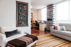 A proprietária é uma cliente querida do nosso escritório e possui muito bom gosto. Nos pediu que pensássemos em acabamentos neutros que acolhessem bem aos móveis e objetos de arte popular com procedência de várias partes do mundo que ela possui.