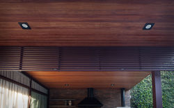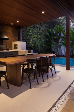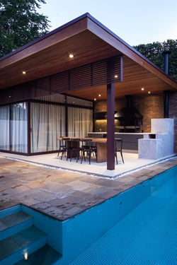 Nesse lote localizado no bairro Chácara Monte Alegre, em São Paulo, existe uma casa principal e havia uma desajeitada edícula que ocupava grande parte da área posterior do terreno, concorrendo com o espaço do entorno da piscina. A encomenda do cliente foi a de construir no local da edícula uma casa de hóspedes que comportasse também uma área para churrasqueira profissional, forno a lenha e uma grande mesa.