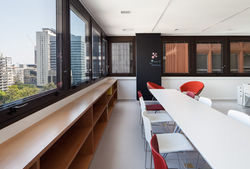 As principais intervenções feitas foram: substituição do equipamento de ar-condicionado, adequação das áreas molhadas e copa, instalação de uma nova rede de dados e elétrica, um sistema de iluminação bem dimensionado e a substituição de todos os revestimentos. O antigo carpete deu lugar a um piso vinílico, mais moderno e prático para o dia a dia. O pilar retangular existente, pintado de preto lousa, permite que as ideias sejam anotadas de forma despojada. O grande armário feito sob medida, foi especialmente desenhado para abrigar impressoras e demais equipamentos de apoio e arquivos de trabalho em papel. Suas portas de correr brancas servem também como telas para projeções em dias de palestras e eventos, devido a suas grandes dimensões. Desenhamos também a estante sob a janela, em compensado folhado de madeira Curupixá, usada para apoio dos livros e folhetos que divulgam o trabalho feito pela empresa. Além disso, especificamos todo o novo mobiliário, de forma que atendesse as expectativas de flexibilidade do layout.